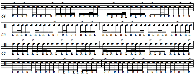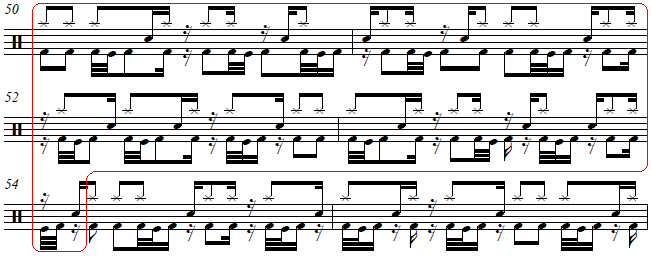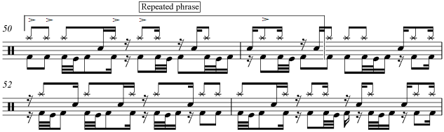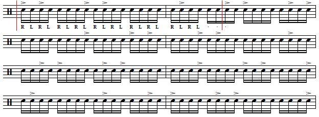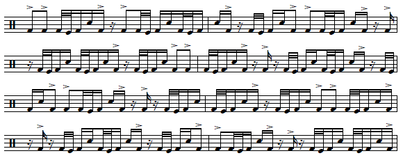 The drum pattern is 11 8th notes in length. Below is a 4 bar excerpt of the drum pattern with accents.