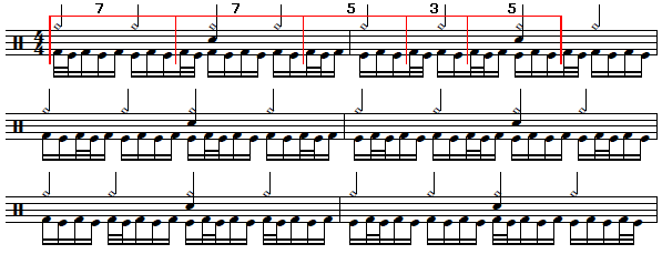 The bass drum pattern in this section is a mixture of the "Herta" pattern in groupings of 3's, 5's and 7's