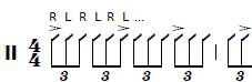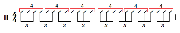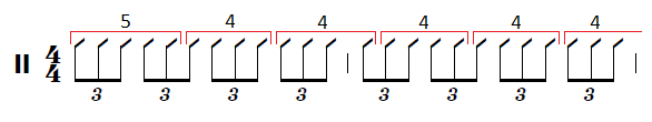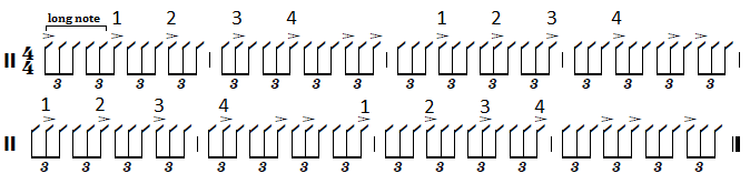 As shown above the riff is 8 bars long, which is often the case in most Meshuggah songs. The best way to learn this riff is to play 8th note triplets and then accent the notes shown above.